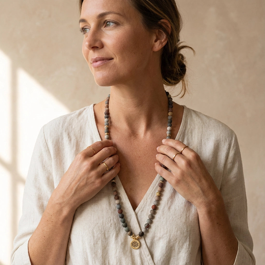 Een mala kan worden gedragen als lange ketting, korte ketting of wikkelarmband. Het is een sieraad gemaakt van 108 natuursteenkralen dat vaak wordt gebruikt tijdens meditatie. De kralen helpen om focus te behouden en intenties te versterken.